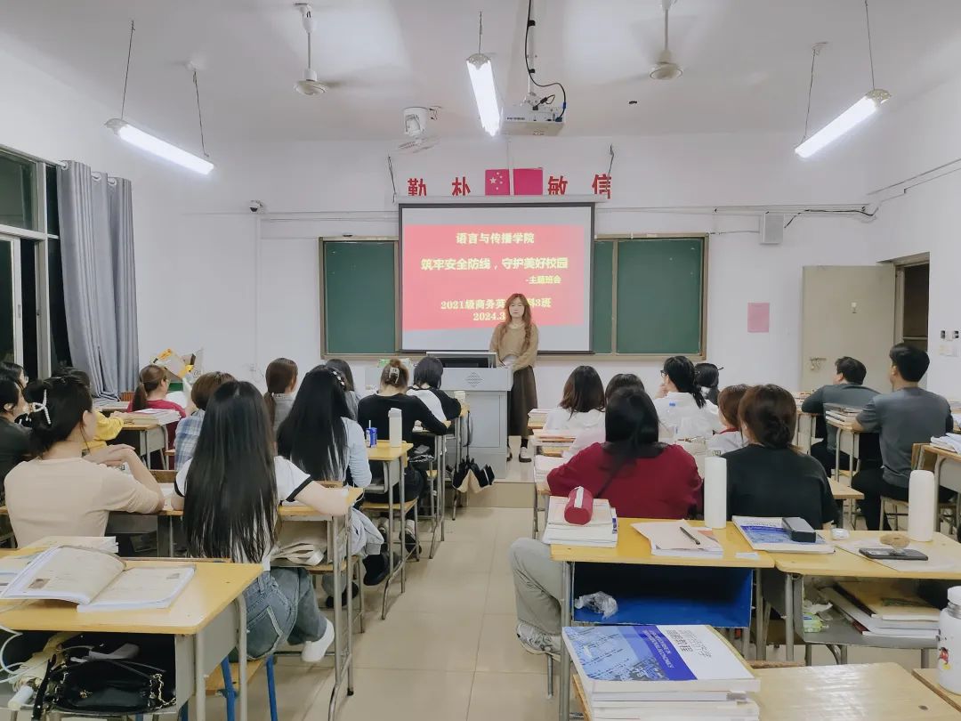 为引导师生积极投身平安校园建设实践,营造平安和谐的校园环境,语言与传播学院于3月31号晚自习开展以“筑牢安全防线,守护美好校园”为主题的班会。