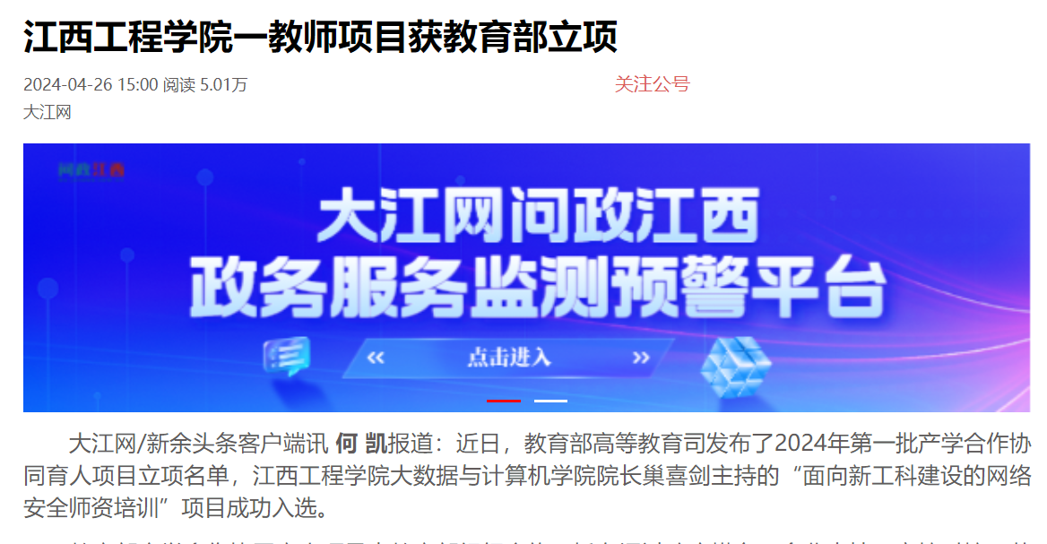 近日,教育部高等教育司发布了2024年第一批产学合作协同育人项目立项名单,beat365体育官方网站大数据与计算机学院院长巢喜剑主持的“面向新工科建设的网络安全师资培训”项目成功入选。