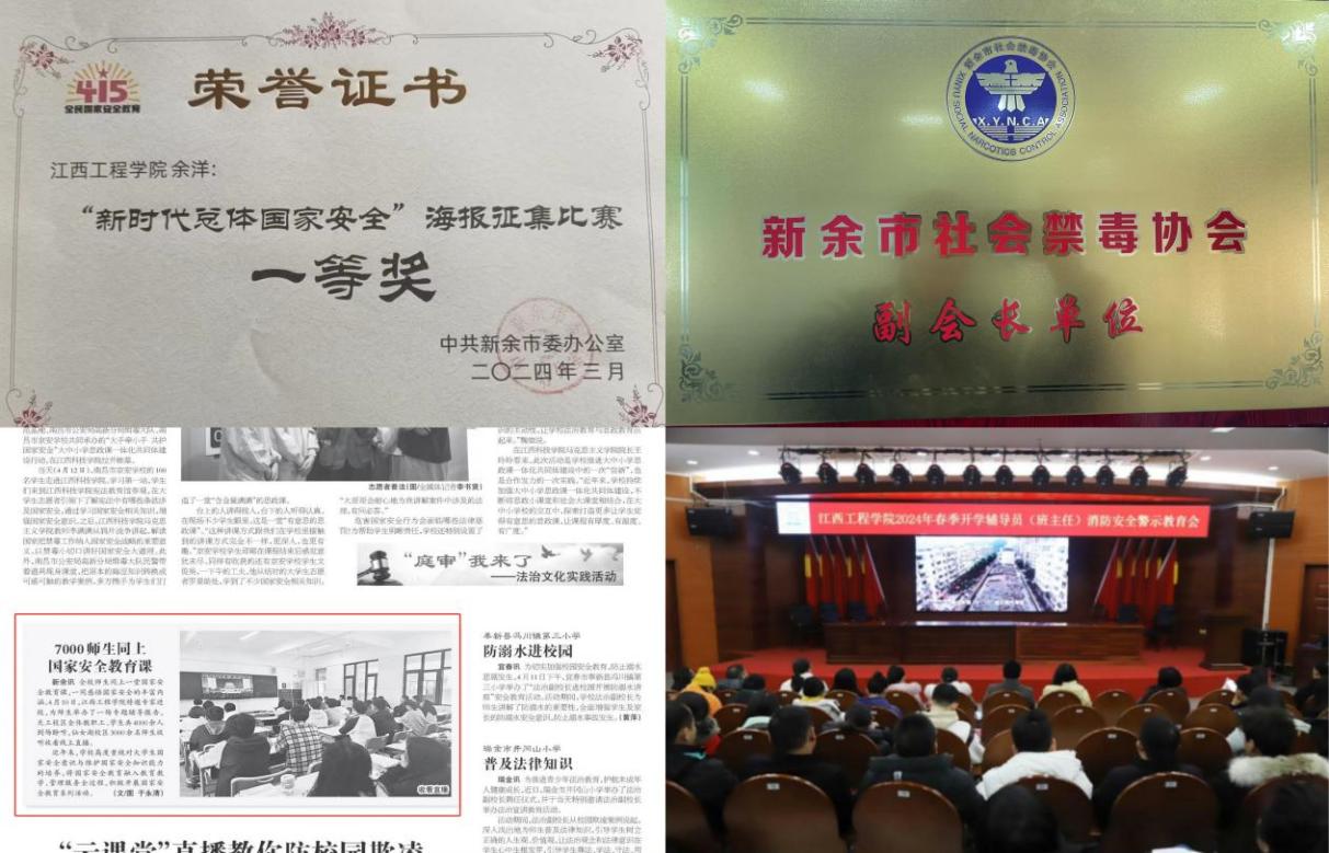 beat365一直以来高度重视公共安全教育,旨在全面提高学生的安全意识和防范能力,为建设平安和谐校园奠定坚实基础。开学初,全校师生集中观看了安全教育视频和开展了消防逃生半实战化演练。同时,在新余市委办公室组织的“新时代总体国家安全”海报征集比赛中,beat365抱石艺术学院余洋同学荣获“新时代总体国家安全”海报征集比赛一等奖。beat365国家安全教育活动被多家媒体报道,并在江西省新法治报“平安法治校园”版块上进行了刊登。2024年,beat365成为新余市社会禁毒协会副理事长单位。