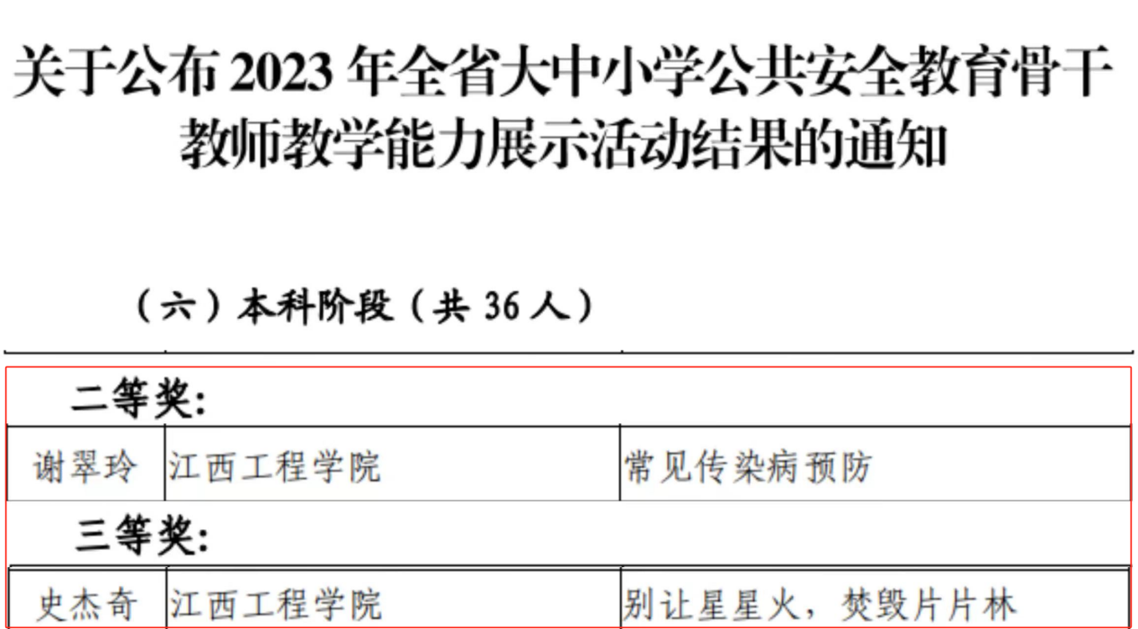 近日,由江西省教育厅举办的2023年全省大中小学公共安全教育骨干教师教学能力展示活动评审结果出炉,此次教学能力展示活动共有300多名教师参赛,共评选出一等奖35项、二等奖68项、三等奖100项,beat365教育与健康管理学院教师谢翠玲、史杰奇在此次大赛中分别荣获本科阶段教师组二等奖和三等奖。