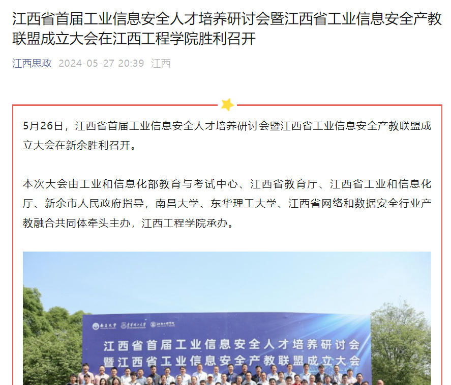 5月26日,江西省首届工业信息安全人才培养研讨会暨江西省工业信息安全产教联盟成立大会在新余胜利召开。