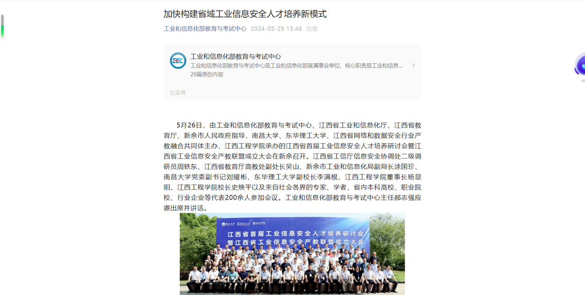 此次研讨会受到江西省委教育工委、省教育厅高度重视,研讨会以推进工业信息安全领域职普融通、产教融合、科教融汇为目标,以工业信息安全领域人才培养、技术研发、社会服务、文化传承为纽带桥梁,旨在推动跨区域汇聚产教资源,有效促进产教布局匹配、服务高效对接、支撑全行业发展,对推进工业信息安全行业创新链、产业链、人才链深度融合起到重要作用。