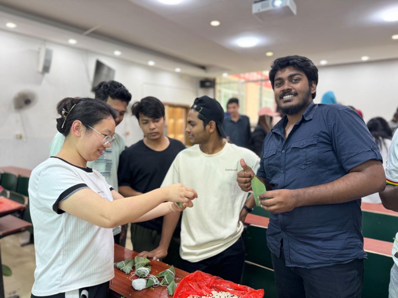在老师们的指导下,留学生们纷纷挽起袖子,亲手尝试包粽子。虽然开始时手法生疏,但在不断的练习和老师的悉心指导下,大家逐渐掌握了包粽子的技巧。现场气氛热烈,留学生们一边包粽子,一边交流学习心得,不仅锻炼了动手能力,还增进了彼此之间的友谊。