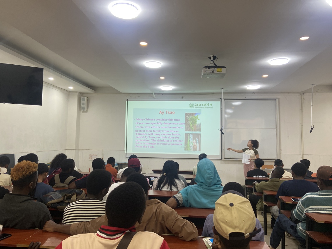 活动伊始,国际教育学院副院长陈璐详细介绍了端午节的由来和传统习俗。通过讲述屈原的故事,让留学生们深刻理解了端午节所蕴含的深厚文化底蕴和人情味。随后,播放了包粽子的教学视频,向学生们展示了制作粽子的每一个步骤。