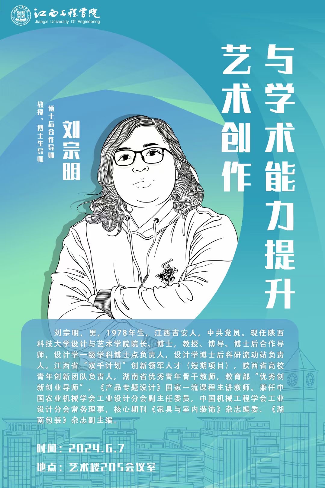 2024年6月7日上午10:00,抱石艺术学院开展“文创设计赋能地方文化产业发展论坛”系列讲座,其中《艺术创作与学术能力提升》专题讲座由刘宗明教授在艺术楼205会议室主讲,江西科技师范大学美术学院二级教授、硕士研究生导师赵勤,江西勤之建筑装饰工程有限公司创始人、高级工程师文勤,仙女湖艺术文旅产业学院副院长苗珍廷、视觉创达设计教研室主任王冬冬以及全体教师参会聆听。讲座由苗珍廷主持。