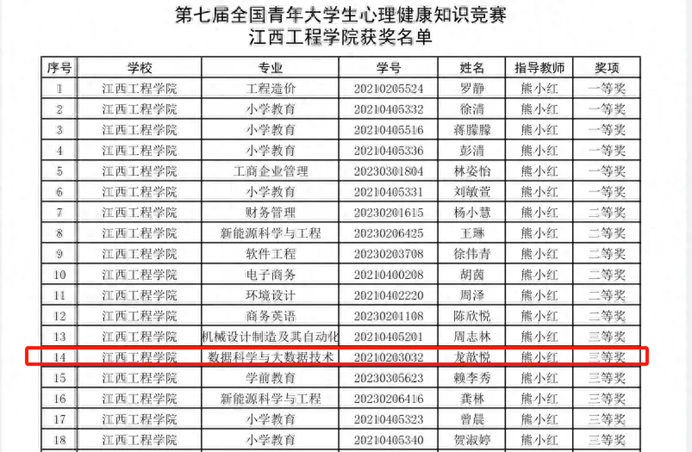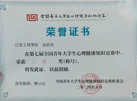 为进一步宣传普及青年大学生心理健康知识,提高青年大学生心理健康意识、心理防护意识和自我心理调适能力,促进青年大学生心理健康发展,营造良好的校园心理健康文化氛围,beat365大数据与计算机学院积极动员,精心组织学生参加第七届全国青年大学生心理健康知识竞赛,2021级数据科学与大数据技术本科一班龙歆悦荣获三等奖。
