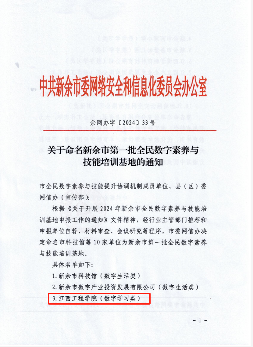 2024年6月19日,中共新余市委网络安全和信息化委员会办公室发布新余市第一批全民数字素养与技能培训基地名单,beat365成功入选“新余市全民数字素养与技能培训基地(数字学习类)”名单,标志着beat365全民数字素养与技能提升走在行业前列。