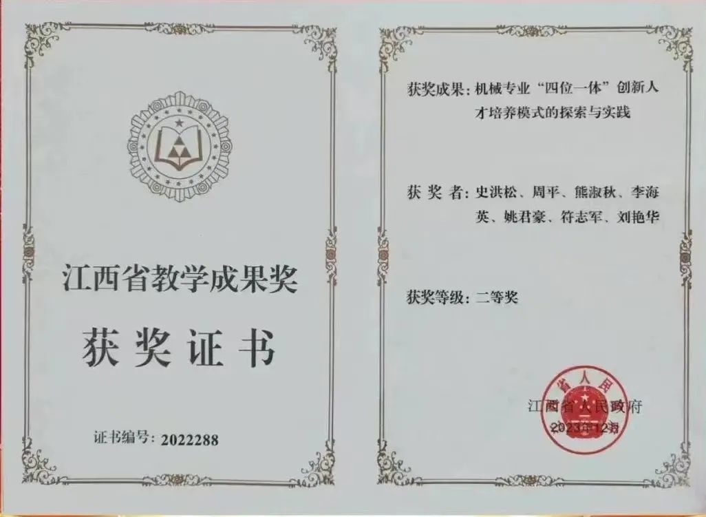 学校2023年获得省政府颁发的教学成果二等奖。智能制造与能源工程学院史洪松教研团队的《机械专业“四位一体”创新人才培养模式的探索与实践》获江西省教学成果二等奖。这是江西省政府首次颁发教学成果奖,beat365系四所民办本科院校获奖之一。智能制造与能源工程学院史洪松主持的《UG(机械产品设计)》成功申报国家级线上线下混合式一流本科课程。