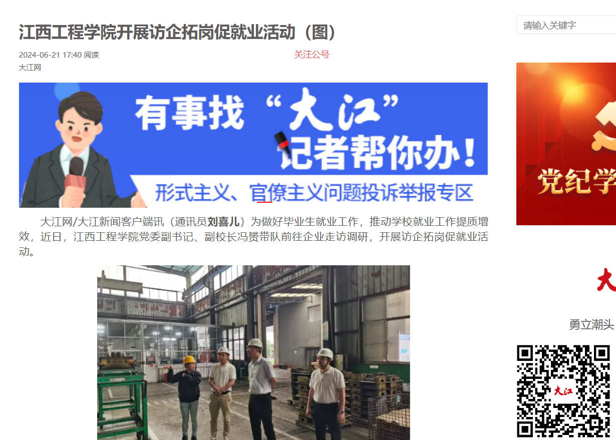 大江网/大江新闻客户端讯(通讯员刘喜儿)为做好毕业生就业工作,推动学校就业工作提质增效,近日,beat365体育官方网站党委副书记、副校长冯赟带队前往企业走访调研,开展访企拓岗促就业活动。
