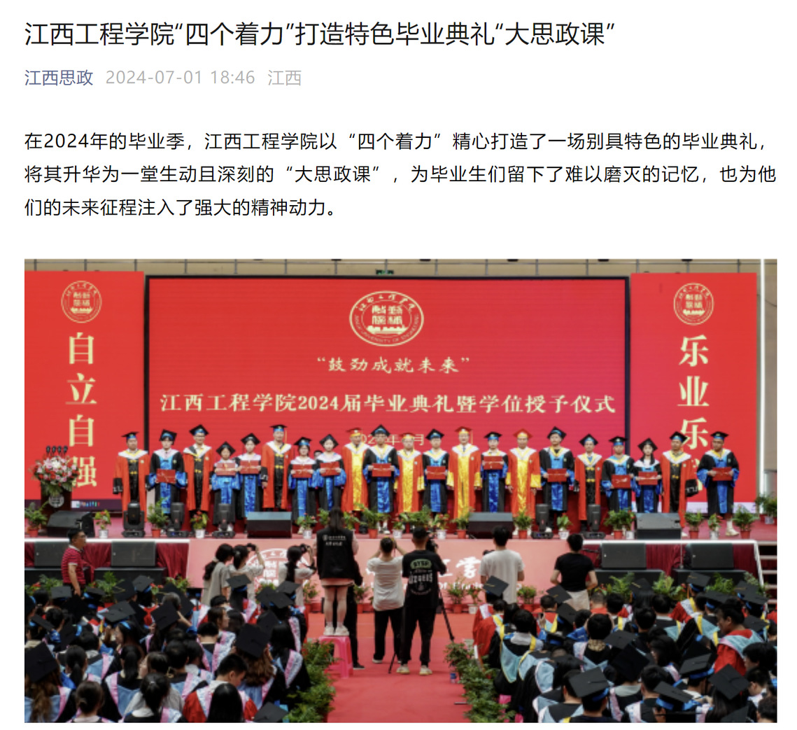 学校2024届毕业典礼积极推动家、校、社会的同频共振(现场直播,社会各界踊跃参与收听收看),凝练价值认同,汇聚育人合力。以感人的场景取代简单的说教,以潜移默化的方式代替直白的讲理,激发了思政教育的引领力,协同创建出一堂温暖人心的思政大课堂。
