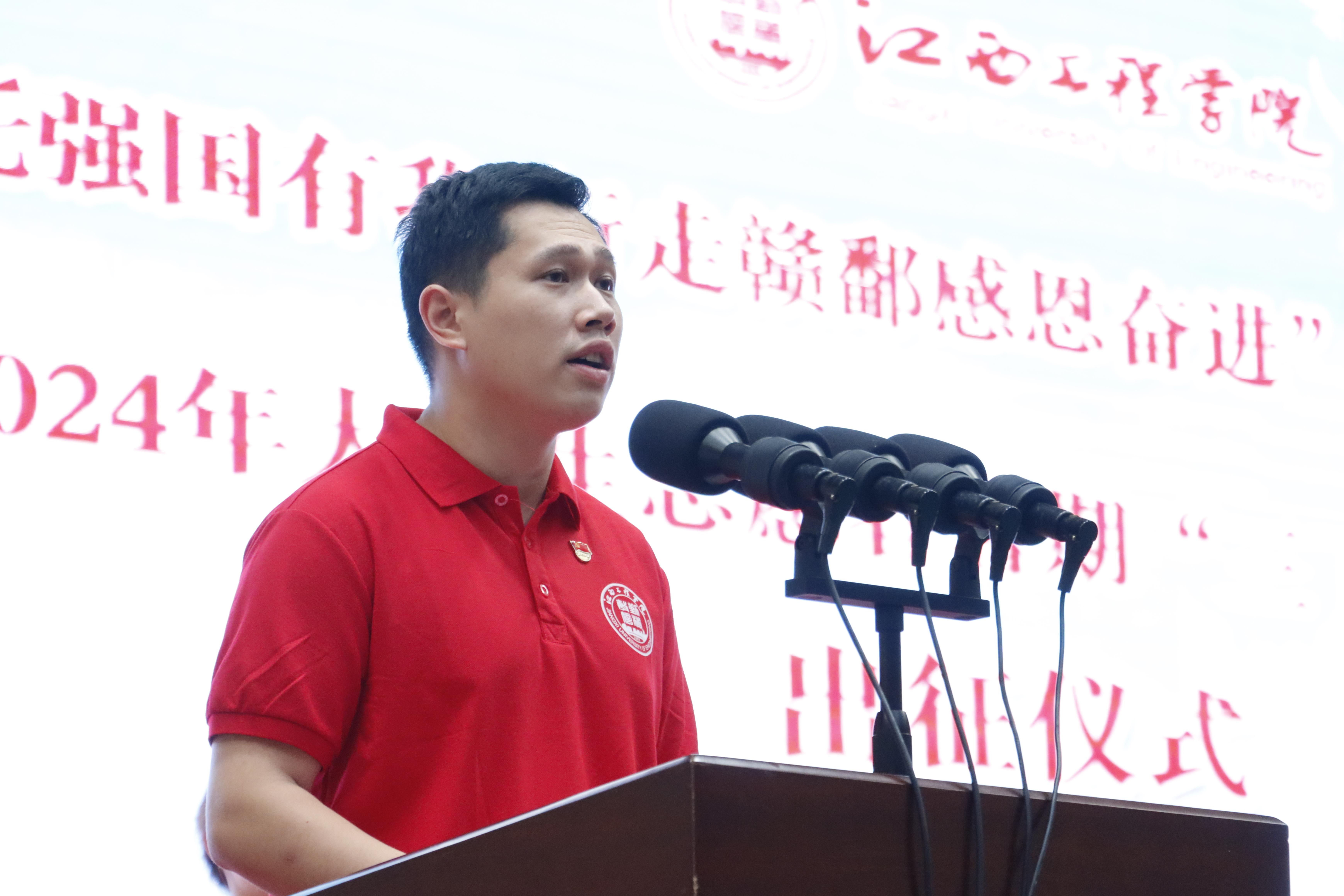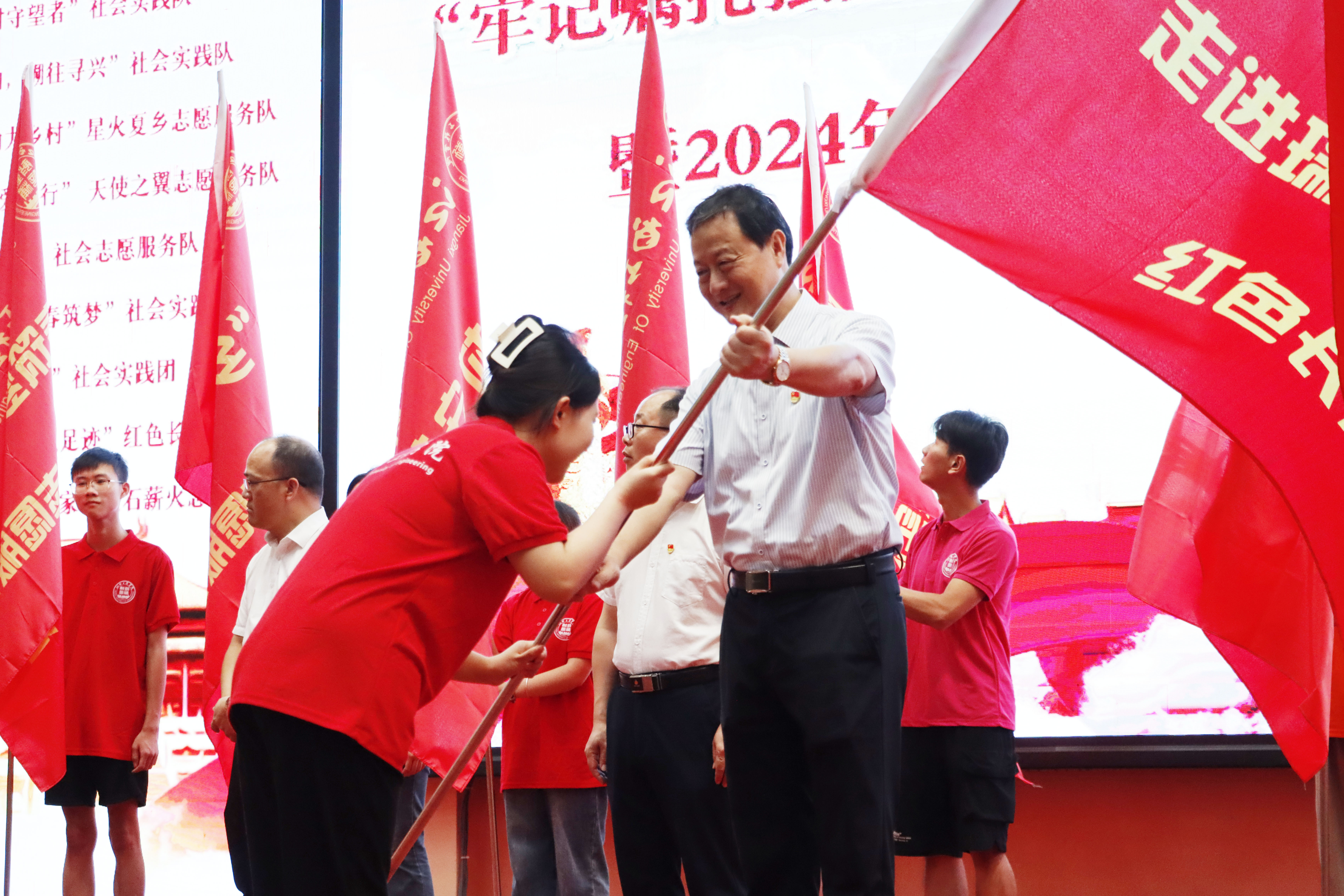 仪式上,教育健康管理学院团总支书记胡子龙、2021级财务管理本科5班学生曾梓彧分别代表师生发言。胡子龙表示,作为指导老师,将发挥专业所长,将校园资源联动社会资源实现协同育人,全程陪伴学生,引领青年在实践中磨砺奋斗精神、增强本领、砥砺品行修为,向下扎根汲取力量,向上向阳奋进生长。曾梓彧表示,作为新时代新青年,将秉承“受教育、长才干、作贡献”的社会实践宗旨,践行“勤朴敏信”的校训,到基层去扎根实践,到人民健康最需要的地方去努力奋斗,在广阔的社会天地中展现青春作为、贡献青春力量。