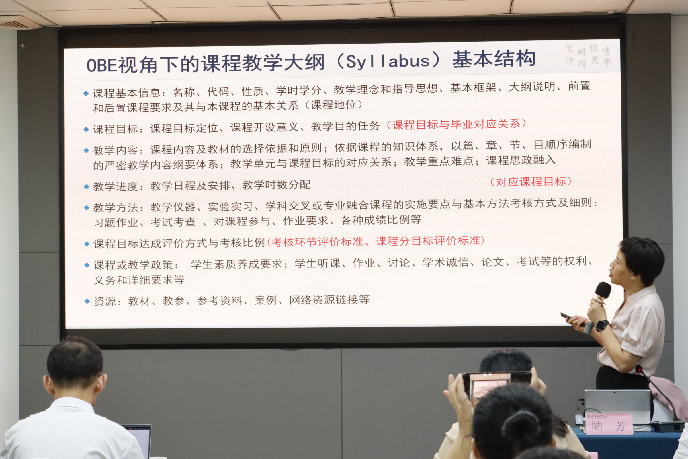 为进一步提高人才培养质量,学校将“学生中心、成果导向、持续改进”的OBE教育理念融入2024年人才培养方案,不断增强教学的实效性与针对性。2024年7月26日,学校邀请华南理工大学陆芳博士作《OBE理念下的成果导向的教学评价》等专题讲座,详细阐述了一线教师与OBE三个纽带之间的联系、课堂教学中的师生互动方法、分阶段设定教学目标与评价体系的要点、课堂教学评价设计与实施的基本路线以及课程设计与考核评价实践案例等内容,使全体学员深刻理解基于OBE理念的课堂创新和混合式教学设计,掌握反向教学设计的具体操作和流程,获取课堂教学互动和真实性评价方法实施的案例,初步掌握课堂教学评价体系的设计与应用技巧,并能运用于教学实践中。