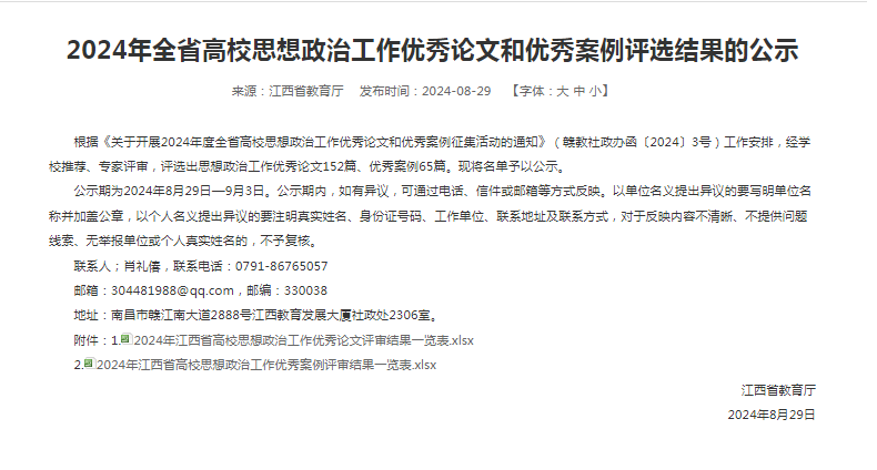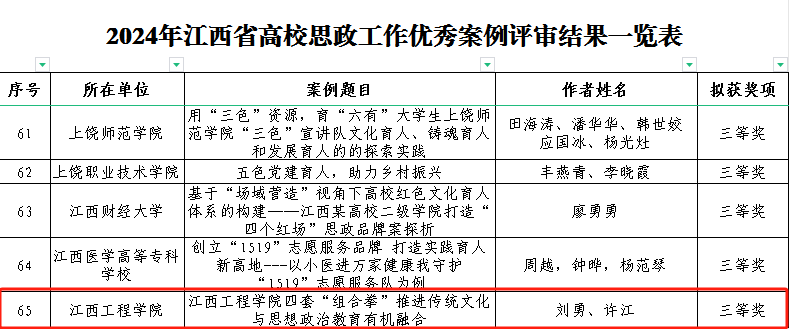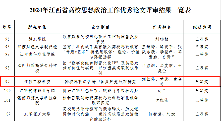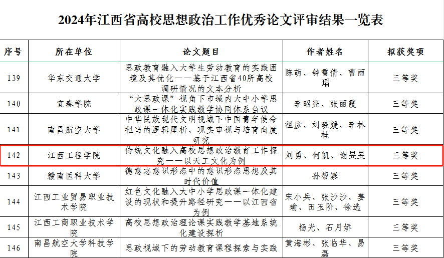 根据《关于开展2024年度全省高校思想政治工作优秀论文和优秀案例征集活动的通知》(赣教社政办函〔2024〕3号)文件精神,经学校推荐、专家评审,省教育厅评选出思想政治工作优秀论文152篇、优秀案例65篇。其中,beat365刘红伟、尹璐、袁金芳老师报送的《高校思政课讲好中国共产党故事研究》和刘勇、何凯、谢旻旻老师报送的《传统文化融入高校思想政治教育工作探究——以天工文化为例》拟获2024年江西省高校思想政治工作优秀论文三等奖,刘勇、许江老师报送的《beat365体育官方网站四套“组合拳”推进传统文化与思想政治教育有机融合》拟获2024年江西省高校思政工作优秀案例三等奖。