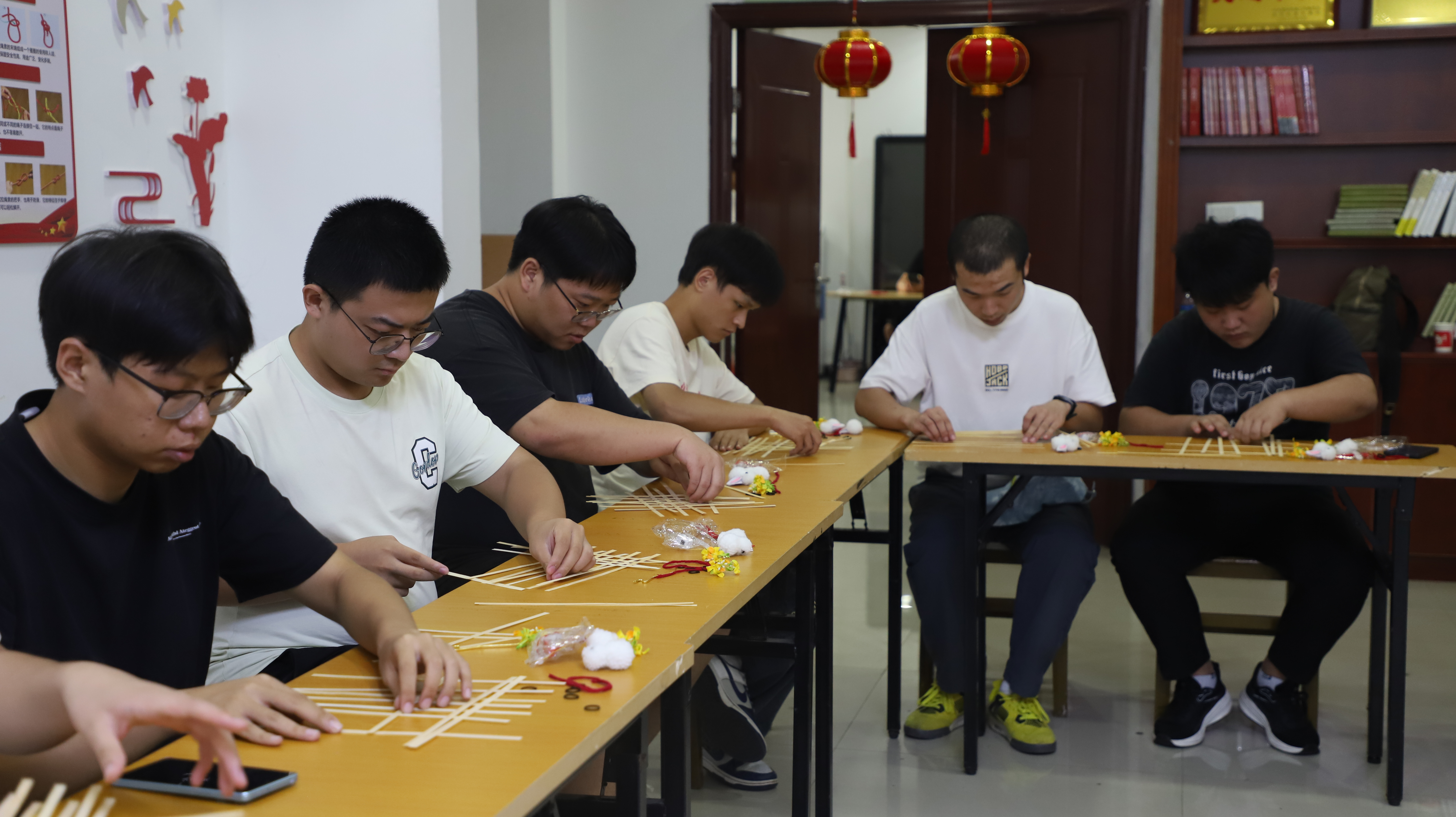 在虎山社区,竹编手艺人向大家介绍竹编的历史源流及传承意义,指出竹编技艺来源于普通人民生活中,经过历史的演变逐渐走向后来的艺术性。随后,同学们和社区居民分散到各桌动手编织。整个学习过程其乐融融,大家通过“压”“挑”等技巧,制作出小型的竹编“船灯”编织品,并为它们点缀上发光灯装饰品,将编织品变为一个个中秋“灯笼”。“很有氛围感,做出来的成品非常好看!”2023级电子商务本科2班余婷表示,竹编在人们的日常生活中逐渐消失,作为新时代青年大学生,我们要主动去了解这门传统文化,主动学习。