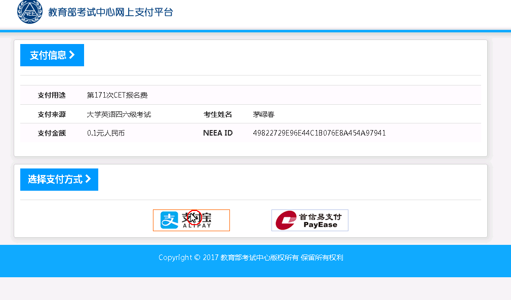 进入支付信息页面,可以选择支付宝支付,也可以选择首信易支付两种支付方式