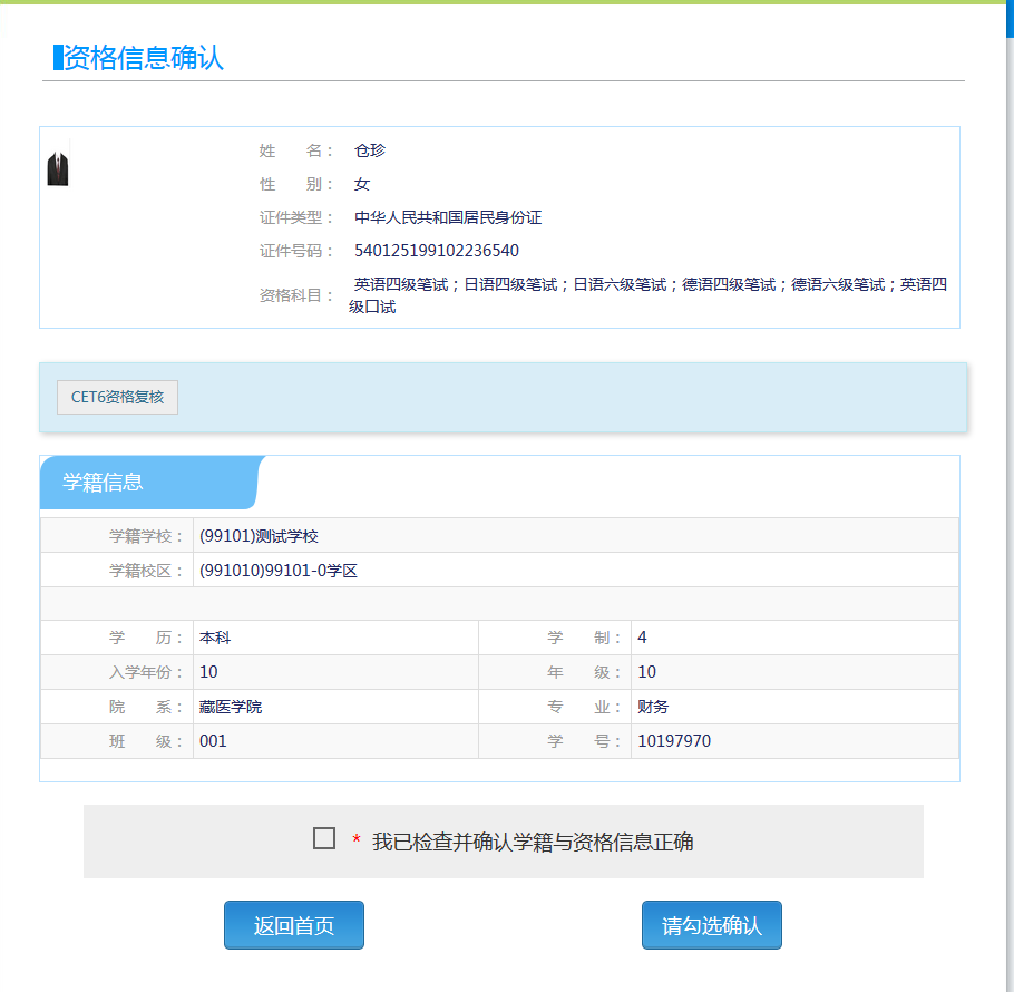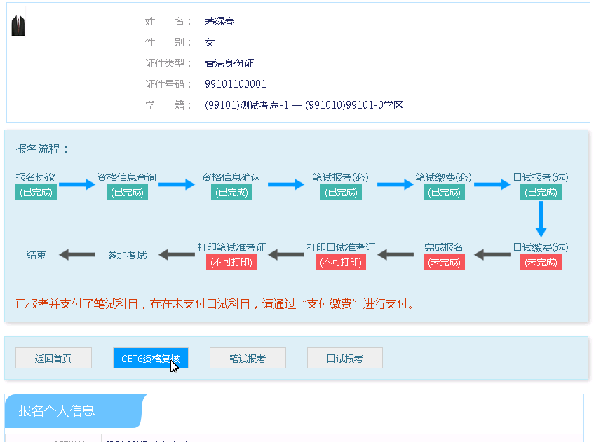 考生可以在这个页面,检查自己的照片和基本信息是否正确,查看自己的报考资格科目和进行CET6资格复核申请。