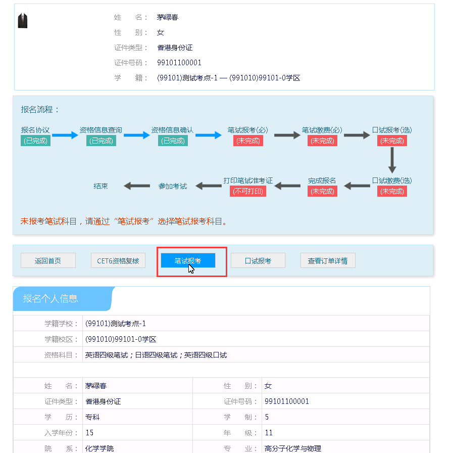 在考生报名信息页面,点击“笔试报考”按钮,进入笔试报考页面