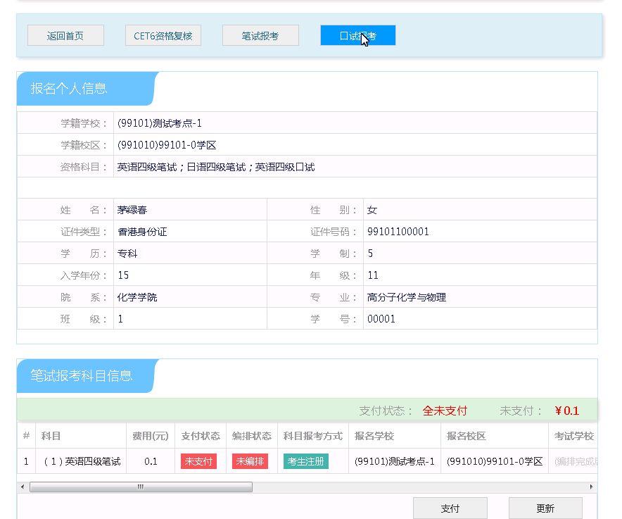选择要报考的科目,点击“提交”按钮,返回到考生报名页面,点击“口试报考”