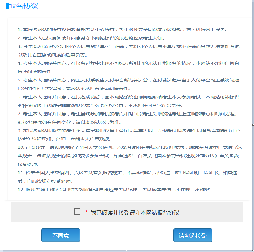报名协议页面,勾选同意