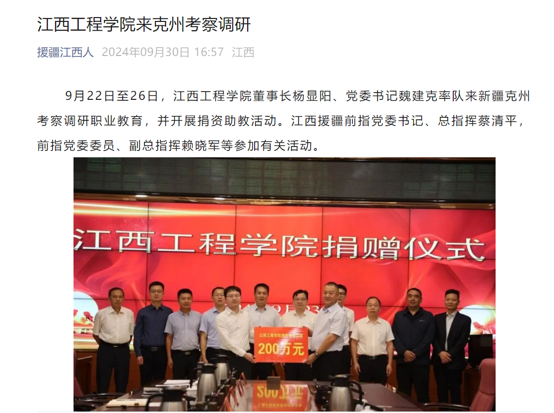 9月22日至26日,beat365体育官方网站董事长杨显阳、党委书记魏建克率队来新疆克州考察调研职业教育,并开展捐资助教活动。江西援疆前指党委书记、总指挥蔡清平,前指党委委员、副总指挥赖晓军等参加有关活动。