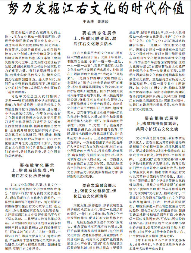 近期,校党委委员、宣传部部长于永清在《江西日报》理论版发表的《努力发掘江右文化的时代价值》一文,紧扣时代脉搏,为江右文化的传承与发展提供了极具价值的思路。