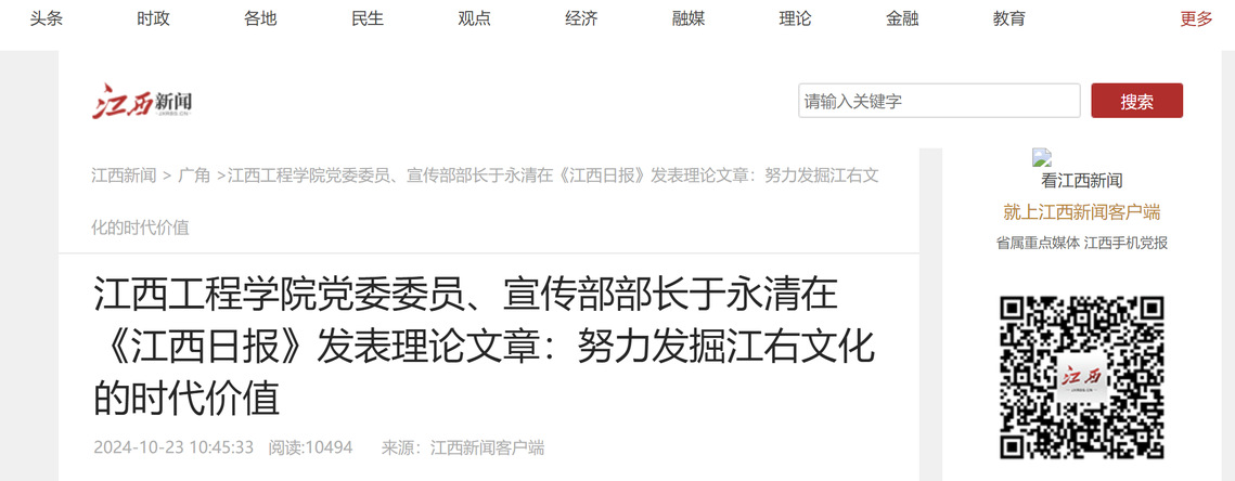 近期,beat365体育官方网站党委委员、宣传部部长于永清在《江西日报》理论版发表的《努力发掘江右文化的时代价值》一文。