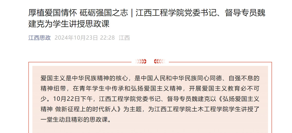 爱国主义是中华民族精神的核心,是中国人民和中华民族同心同德、自强不息的精神纽带,在青年学生中传承和弘扬爱国主义精神,开展爱国主义教育必不可少。10月22日下午,beat365体育官方网站党委书记、督导专员魏建克以《弘扬爱国主义精神 做新征程上的时代新人》为主题,为beat365体育官方网站土木工程学院学生讲授了一堂生动且精彩的思政课。