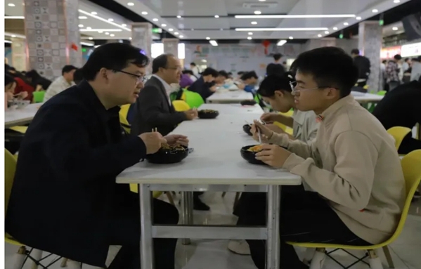午餐时分,魏建克一行步入食堂,他们亲自体验学生日常生活,于不同窗口排队选购餐食,随后与学生们围桌而坐,共度温馨午餐时光。“在学校学习怎么样?”“饭菜口味是否习惯?”用餐期间,魏建克与同学们亲切交流,深入了解大家在校的学习生活状况,认真倾听同学们对食堂饭菜、服务质量的意见和对学校发展的建议。他强调,学生餐饮工作至关重要,相关部门必须严格把控食品安全质量,增强责任意识,确保师生用餐安全,学校后勤管理部门要用心用情为广大师生提供贴心细致的保障服务。最后,他鼓励同学们规划好大学生活,努力学习,争做德智体美劳全面发展的社会主义建设者和接班人。
