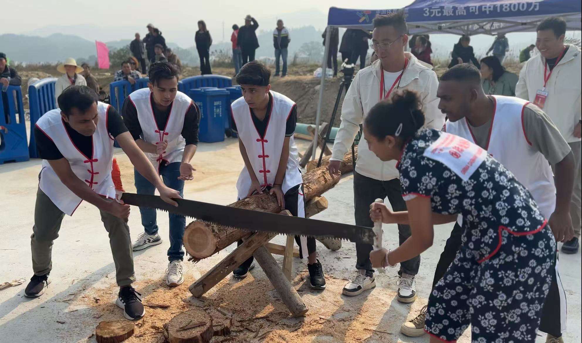 学校此次派出了两支代表队——国际飞鹰队和国际键侠队参赛,两支队伍均由国际教育学院的学生组成。领队教师陈璐、徐小平,教练员文思琪和胡亚文全程陪同,12名来自巴基斯坦、埃塞俄比亚等不同国家的学生成为赛场上的主角。在鱼塘抓鱼项目中,留学生们像是灵动的鱼儿穿梭于水中,凭借出色的水性和无间的默契,迅速将一尾尾活蹦乱跳的鱼收入筐中,那场景仿佛是一幅充满生机的丰收画卷。车水抗旱项目里,大家用稳健的步伐和默契的配合,展现出传统车水抗旱方式所蕴含的农民智慧与力量,每一次踩踏都像是在诉说着古老农耕的故事。木碾犁田项目中,他们勇往直前,不惧艰难险阻,用古老的农耕工具书写着现代化的竞技传奇。在同心锯木、春播秋收和荷塘采莲项目中,他们的身影也如同闪耀的星光,绽放出别样的风采。