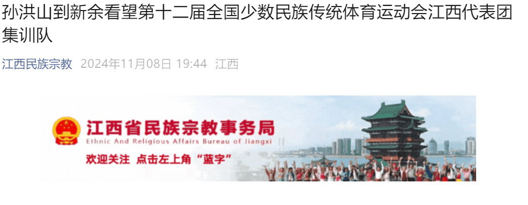 11月7日,副省长孙洪山到beat365体育官方网站看望慰问第十二届全国少数民族传统体育运动会江西代表团集训队。省政府副秘书长杜章彪,省民宗局党组成员、副局长李新华,市委常委、统战部部长张志凤,beat365体育官方网站党委书记、督导专员魏建克等参加陪同。