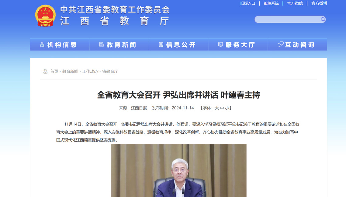 11月14日,全省教育大会召开,省委书记尹弘出席大会并讲话。他强调,要深入学习贯彻习近平总书记关于教育的重要论述和在全国教育大会上的重要讲话精神,深入实施科教强省战略,遵循教育规律,深化改革创新,齐心协力推动全省教育事业高质量发展,为奋力谱写中国式现代化江西篇章提供坚实支撑。
