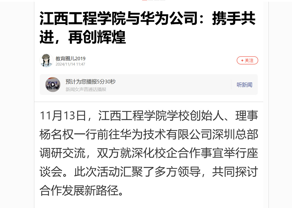 杨名权介绍了学校学科布局与华为业务领域和产业布局的高度契合性。近年来,双方在科研攻关、平台共建、人才培养等多领域展开了深层次合作,打造了校企合作的示范样板。他详细介绍了学校实行的“2+1+1” 人才培养模式,即学生学完 2 年基础课后,引进优秀企业工程师到校授课 1年,再通过1年带领学生做好项目开发,让学生足不出校就能拿到高薪。杨名权希望双方进一步优化合作机制,在突破关键性技术、探索新工科建设、打造智慧校园和校级算力平台上深化全方位战略合作,为发展新质生产力,实现高水平科技自立自强,加快建设教育强国、科技强国、人才强国作出更大贡献。