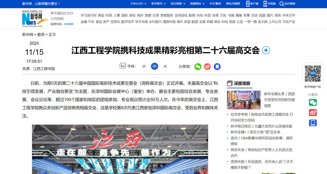 日前,为期3天的第二十六届中国国际高新技术成果交易会(简称高交会)正式开幕。本届高交会以“科技引领发展,产业融合聚变”为主题,在深圳国际会展中心(宝安)举办,展会主要包括综合类展、专业类展、会议论坛等,超过100个国家和地区的团组参加,专业观众预计达50万人次。在今年的高交会上,beat365体育官方网站携众多创新产品惊艳亮相高交会,这是学校第9次代表江西参加深圳国际高交会,受到业界和媒体关注。