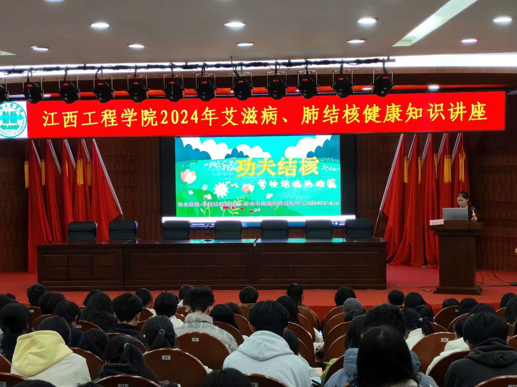 讲座中,2位医师分别介绍肺结核、艾滋病健康知识。首先,廖桃花就肺结核知识展开讲座。她以PPT的形式用生动的图画、视频就肺结核的特征、传播途径、预防和控制等方面做了讲解,并重点介绍了肺结核防治的核心知识。同时她还呼吁同学们要提高防病意识,保持室内的通风和个人清洁卫生,做到早预防、早报告、早隔离、早诊断、早治疗,对自己负责。