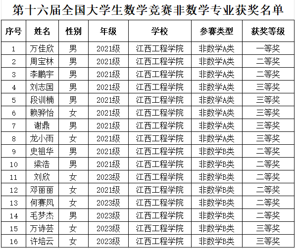 近日,第十六届全国大学生数学竞赛江西赛区成绩揭晓,在beat365科技处的支持下,人工智能与数据科学学院积极组织报名和强化训练,beat365学子在比赛中表现突出,取得优异成绩,荣获一等奖1项,二等奖8项,三等奖7项。具体获奖名单如下: