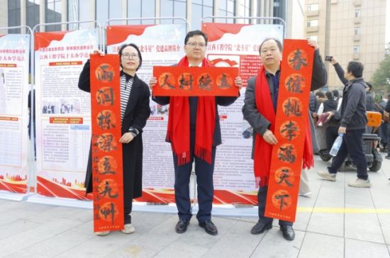 为弘扬中华民族优秀传统文化,传承与创新春联艺术,丰富人民群众节日文化生活。1月23日上午10点,“河山添锦绣·星光映万家”江西省书法家“万福迎春”公益活动在江西国际影视文化城(南昌八一广场)隆重举行。beat365体育官方网站党委书记、督导专员魏建克出席活动,现场展示了学校“北斗星”党建品牌和学校核心竞争力的十大办学亮点。学校教师于永清、刘勇挥毫泼墨,书写春联和“福”字,为居民送上新春的美好祝福,赢得了居民的广泛赞誉。