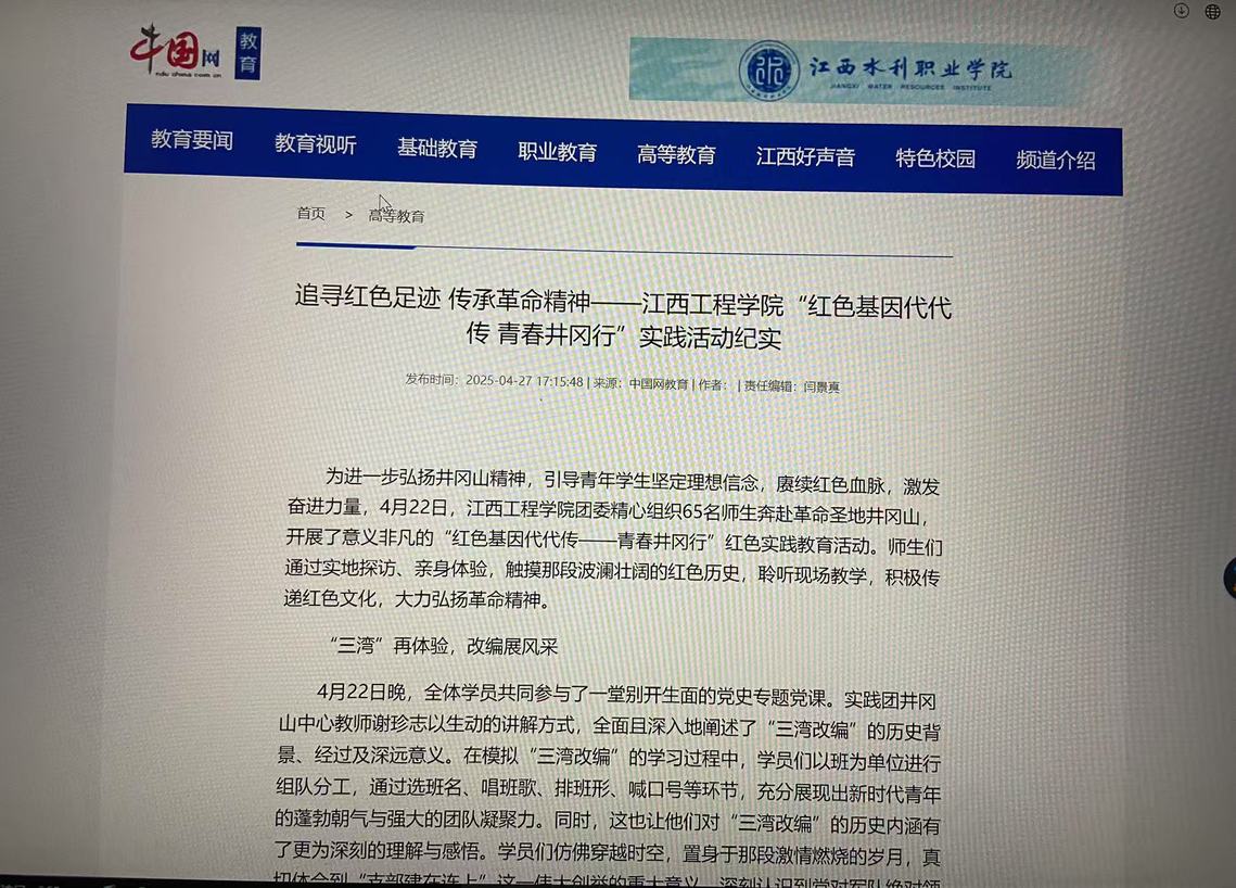 语言与传播学院易晶:“红色基因代代传——青春井冈行”研学中,情景教学重现“三湾改编”,让我领悟党对军队绝对领导的关键意义;专题教学解读“井冈山斗争与井冈山精神”,展现马克思主义中国化的智慧;革命后代访谈让历史鲜活,诠释精神传承;“党领导下的青年运动”专题勾勒青年奋斗画卷。此次研学是使命召唤,我将以井冈山精神为指引,勇担时代使命,贡献青春力量。