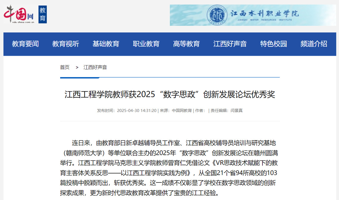 连日来,由教育部日新卓越辅导员工作室、江西省高校辅导员培训与研究基地(赣南师范大学)等单位联合主办的2025年“数字思政”创新发展论坛在赣州圆满举行。beat365体育官方网站马克思主义学院教师曾育仁凭借论文《VR思政技术赋能下的教育主客体关系反思——以beat365体育官方网站实践为例》,从全国21个省94所高校的103篇投稿中脱颖而出,斩获优秀奖。这一成绩不仅彰显了学校在数字思政领域的创新探索成果,更为新时代思政教育改革提供了宝贵的beat365经验。