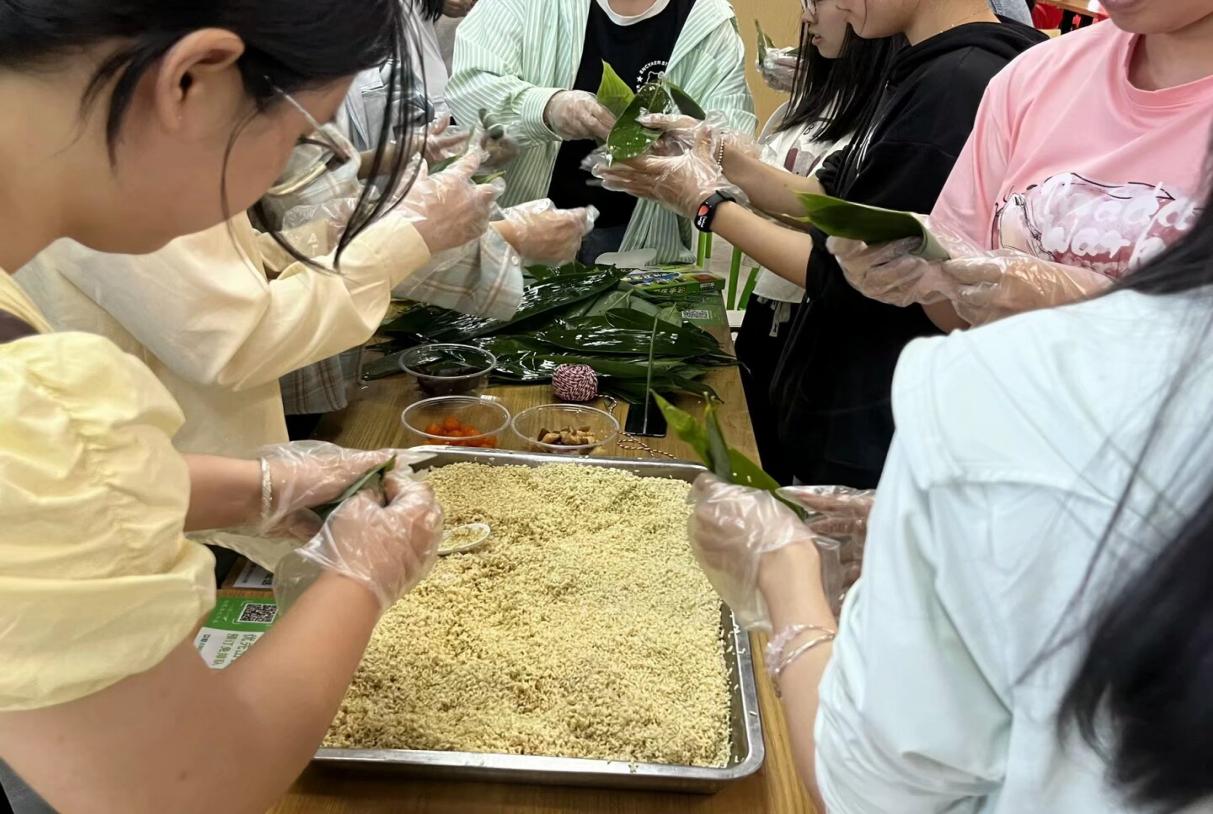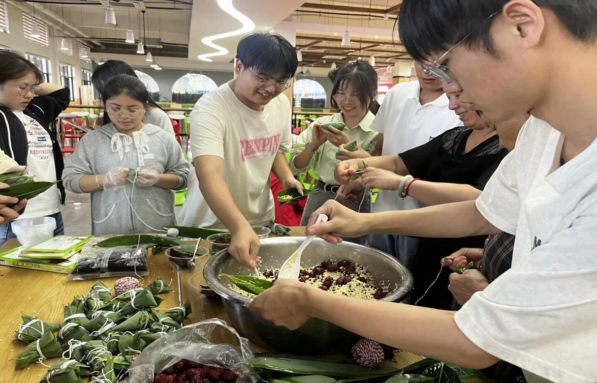 活动现场,糯米、红枣、粽叶等食材整齐罗列,师生们围坐成圈,从粽叶折叠、填米压实到捆扎定型,一步步解锁传统技艺的密码。“粽子的棱角象征着屈原刚正不阿的品格,粽叶的清香恰似千年文化的浸润。”学生干部代表王浩然在示范包粽技巧时,将屈原投江的爱国故事与北斗导航自主创新的奋斗历程巧妙串联,让传统文化教育与思政育人同频共振。