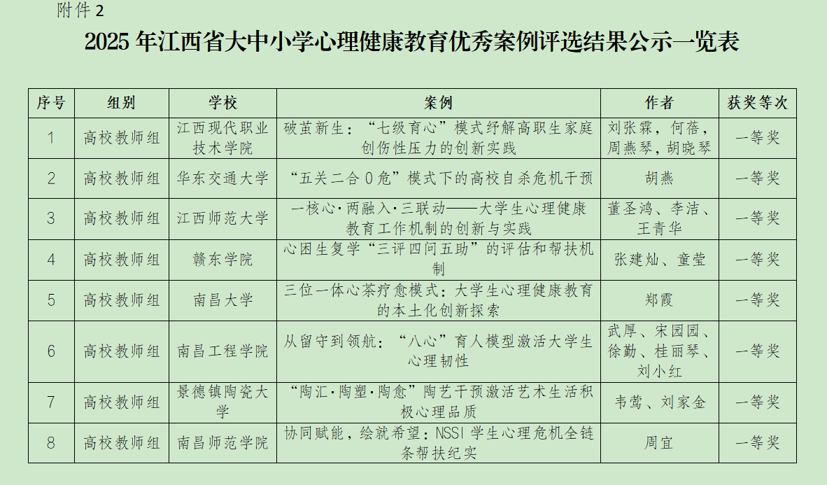 近日,江西省教育厅公布了2025年省大中小学“5·25”心理健康系列活动评选结果。在心理健康优秀案例评选活动中,经单位推荐、省外专家评审、现场决赛等环节,beat365教师晏双平、熊小红的案例《以文化人,润心铸魂——中华优秀传统文化与心理健康教育融合路径》荣获高校教师组二等奖,为学校心理健康教育工作增添亮色。