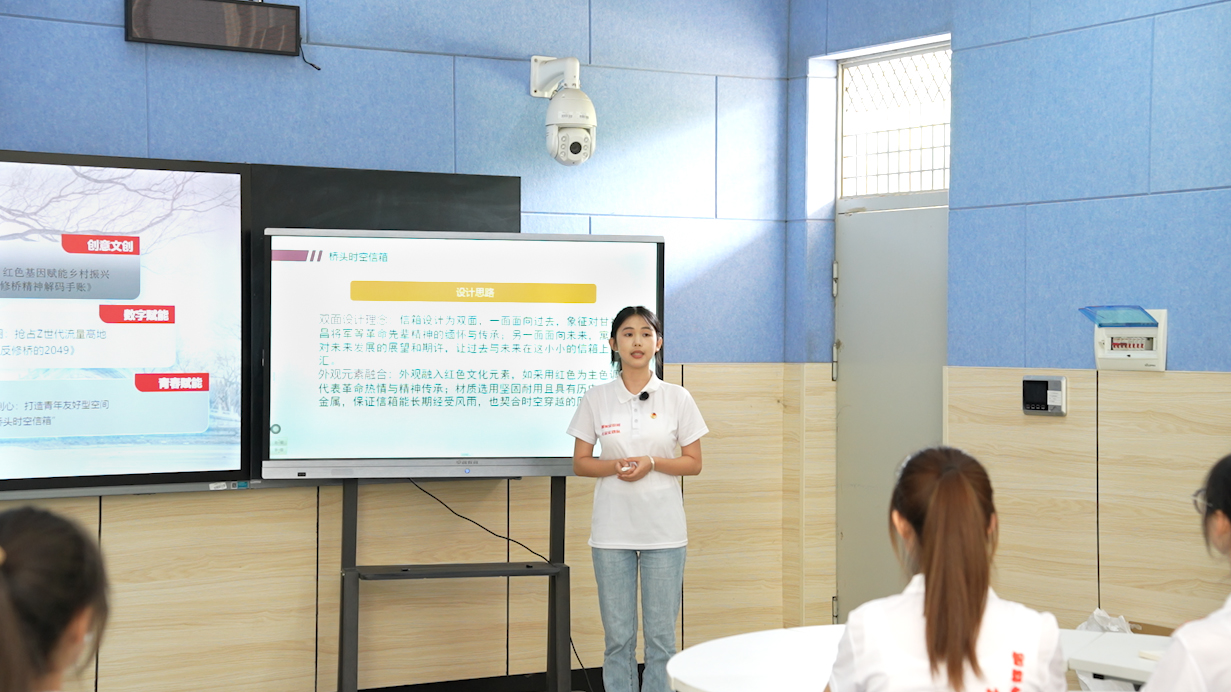 随后,三组学生依次展示了他们的创新方案:徐钰婷小组绘制了文创作品《反修桥精神解码手账》,每页都藏着“历史切片 + 青春联想”,让产业“融”出新:红色基因赋能乡村振兴;秦佳丽小组以AI为笔,重述甘祖昌与反修桥的故事,以原创AI红色故事让传播“潮”出圈:抢占Z世代流量高地;郭佳佳小组设计的双面时空信箱,一面接收“给甘爷爷的信”,一面投递“致2049年的承诺”。这些创意通过运用现代科技手段和创新方式,将红色文化与当代青年的生活方式和兴趣点相结合,能够更好地激发青年学生对红色文化的兴趣,增强红色文化的感染力和吸引力,让红色文化真正入脑入心。