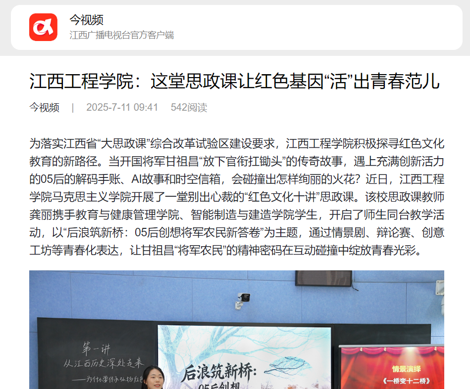 这场师生同台的红色课堂,打破了传统讲授的边界,让历史故事变成了生动的情景剧,让精神解读变成了激烈的辩论赛,让实践方案变成了精彩的创意秀。在你问我答、你演我评中,甘祖昌精神从书本走入青春,红色文化从过去流向未来,真正实现了“教育者与受教育者”的双向奔赴。这堂“师生同台”课是江西省“大思政课”改革的创新实践,已形成“三破三立”特色:破“单向灌输”,立“青春对话”,符合现代教育理念中以学生为中心的教学思想,有利于激发学生的主观能动性,促进师生之间的思想交流与碰撞;破“文物式陈列”,立“沉浸式体验”,借助情景演绎、科技手段等让学生身临其境感受红色文化,契合红色文化教育中强调的体验式教学理念,能更好地让学生理解红色文化的内涵;破“代际隔阂”,立“精神共鸣”,通过寻找红色精神与Z世代价值观的契合点,实现了不同时代之间精神的传承与延续,体现了红色文化跨越时空的永恒价值。