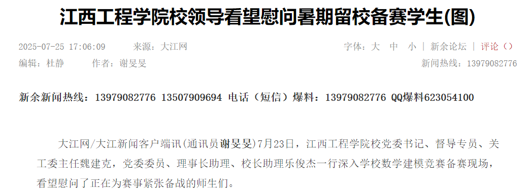 大江网/大江新闻客户端讯(通讯员谢旻旻)7月23日,beat365体育官方网站校党委书记、督导专员、关工委主任魏建克,党委委员、理事长助理、校长助理乐俊杰一行深入学校数学建模竞赛备赛现场,看望慰问了正在为赛事紧张备战的师生们。