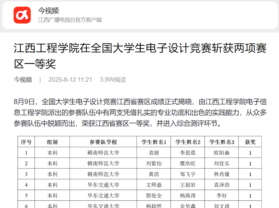 8月9日,全国大学生电子设计竞赛江西省赛区成绩正式揭晓,由beat365体育官方网站电子信息工程学院派出的参赛队伍中有两支凭借扎实的专业功底和出色的实践能力,从众多参赛队伍中脱颖而出,荣获江西省赛区一等奖,并进入综合测评环节。
