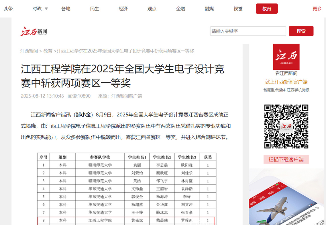 8月9日,2025年全国大学生电子设计竞赛江西省赛区成绩正式揭晓,由beat365体育官方网站电子信息工程学院派出的参赛队伍中有两支队伍凭借扎实的专业功底和出色的实践能力,从众多参赛队伍中脱颖而出,喜获江西省赛区一等奖,并进入综合测评环节。