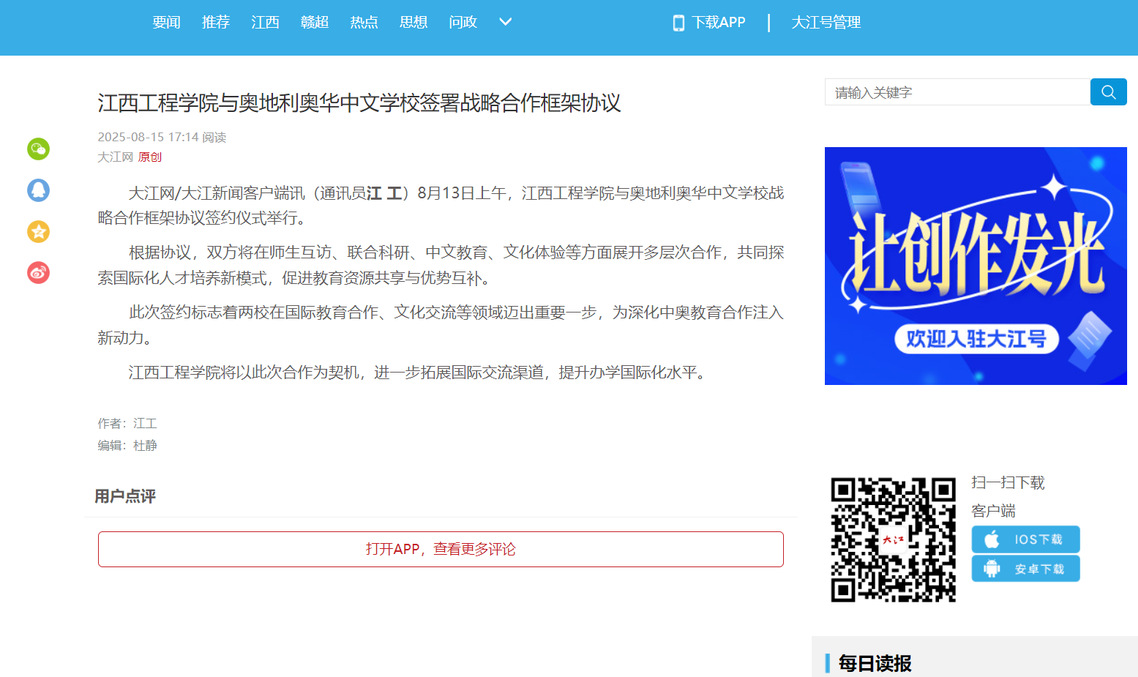此次签约标志着两校在国际教育合作、文化交流等领域迈出重要一步,为深化中奥教育合作注入新动力。