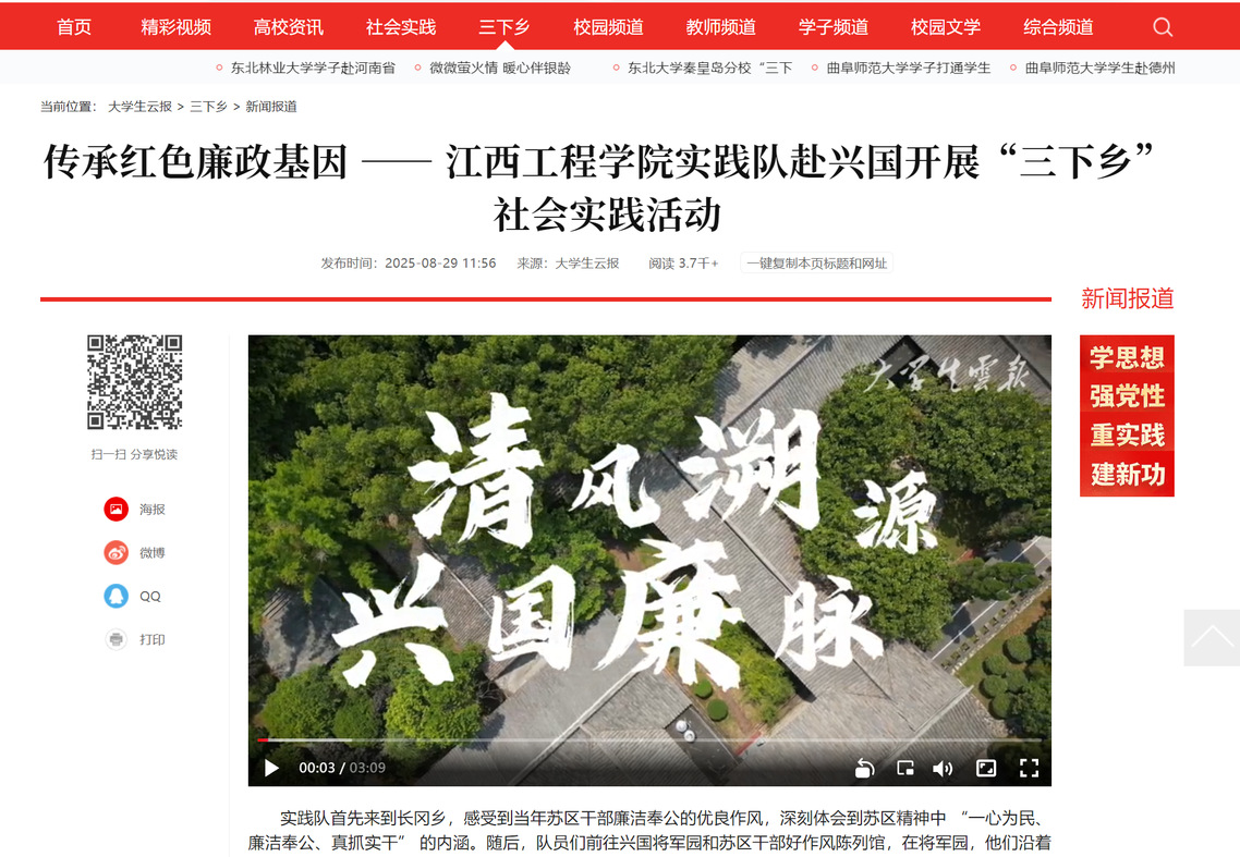 实践队首先来到长冈乡,感受到当年苏区干部廉洁奉公的优良作风,深刻体会到苏区精神中“一心为民、廉洁奉公、真抓实干” 的内涵。随后,队员们前往兴国将军园和苏区干部好作风陈列馆,在将军园,他们沿着先辈足迹,重温峥嵘岁月,感受老一辈 革 命 者坚守廉政底线的崇高品格。在陈列馆,通过自带干粮去办公的米袋、夜打灯笼访贫农的油灯等实物与史料,队员们沉浸式体验了苏区干部廉洁自律的工作日常,坚定了以青春之力传承红色廉政基因、服务乡村发展的信念。此次兴国之行,是一次红色文化探寻之旅,更是一次传承红色基因、担当时代责任的实践征程。(杨定海)
