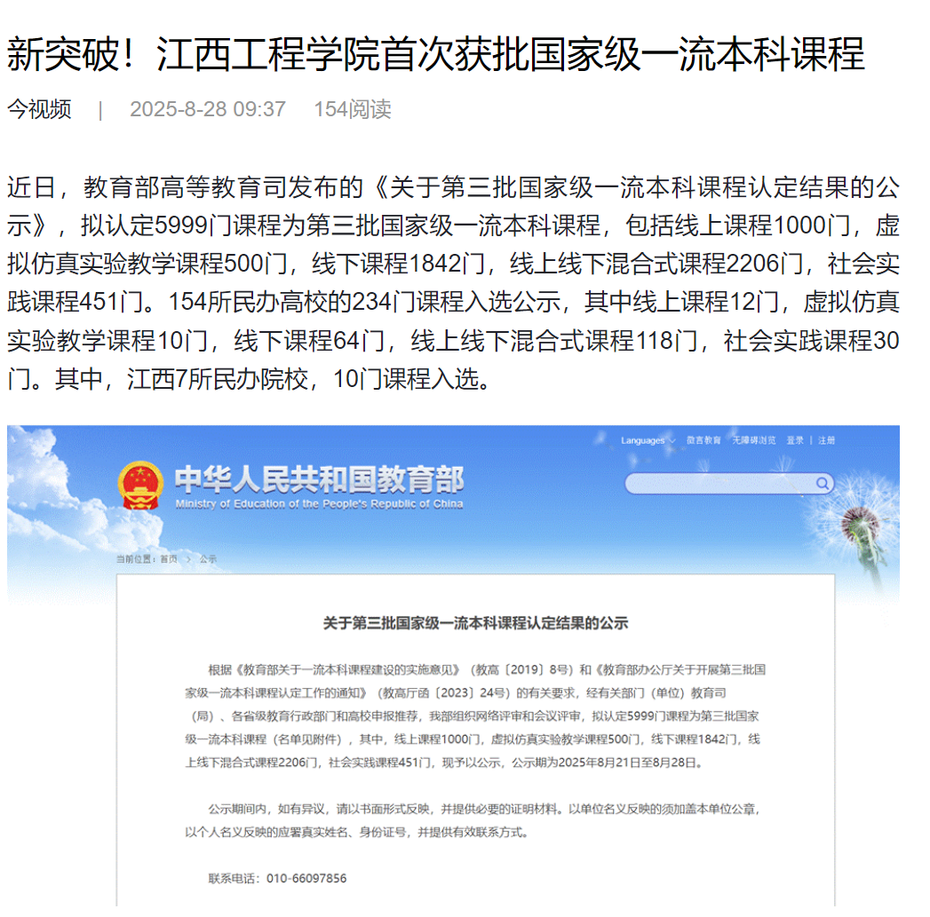 近日,教育部高等教育司发布的《关于第三批国家级一流本科课程认定结果的公示》,拟认定5999门课程为第三批国家级一流本科课程,包括线上课程1000门,虚拟仿真实验教学课程500门,线下课程1842门,线上线下混合式课程2206门,社会实践课程451门。154所民办高校的234门课程入选公示,其中线上课程12门,虚拟仿真实验教学课程10门,线下课程64门,线上线下混合式课程118门,社会实践课程30门。其中,江西7所民办院校,10门课程入选。
