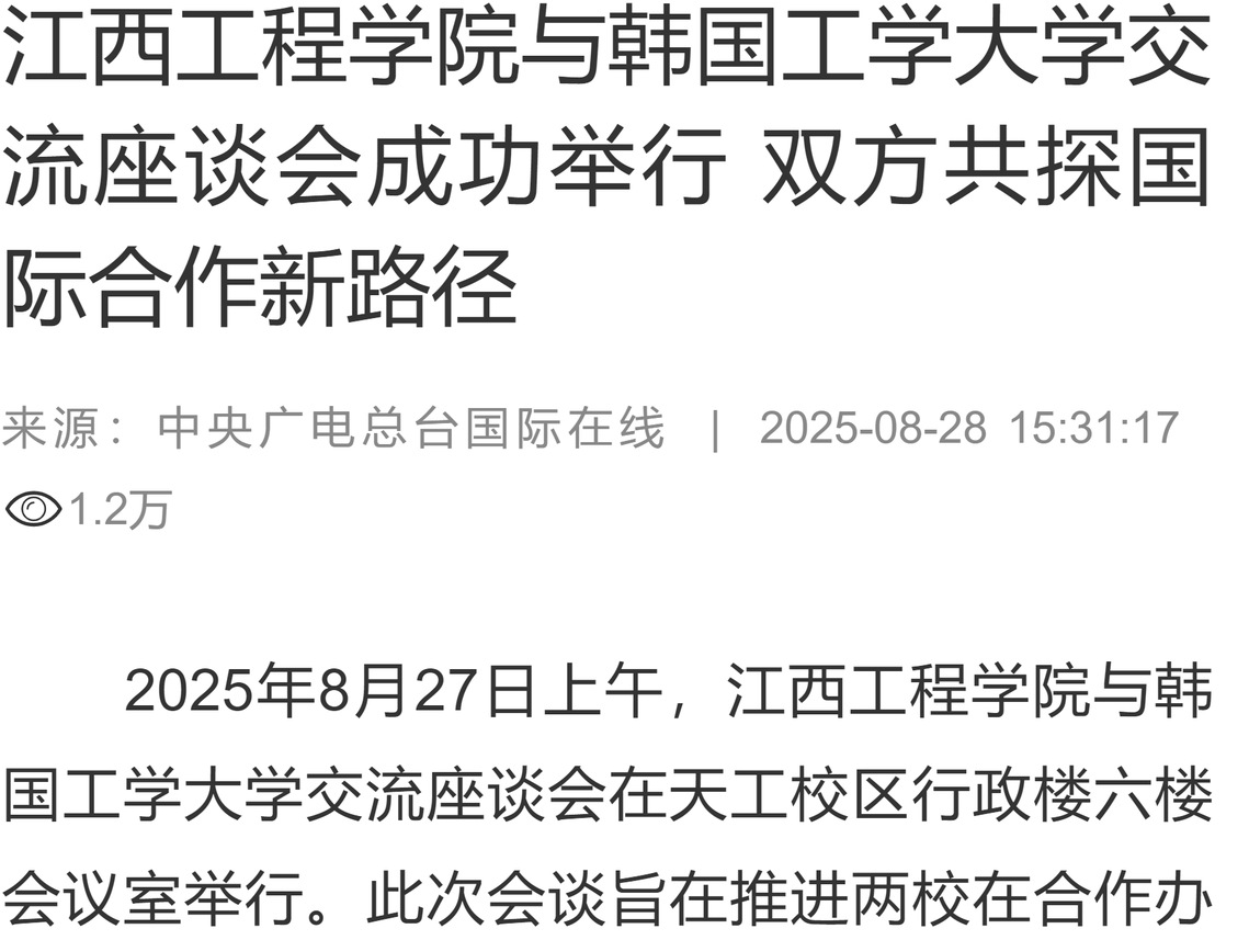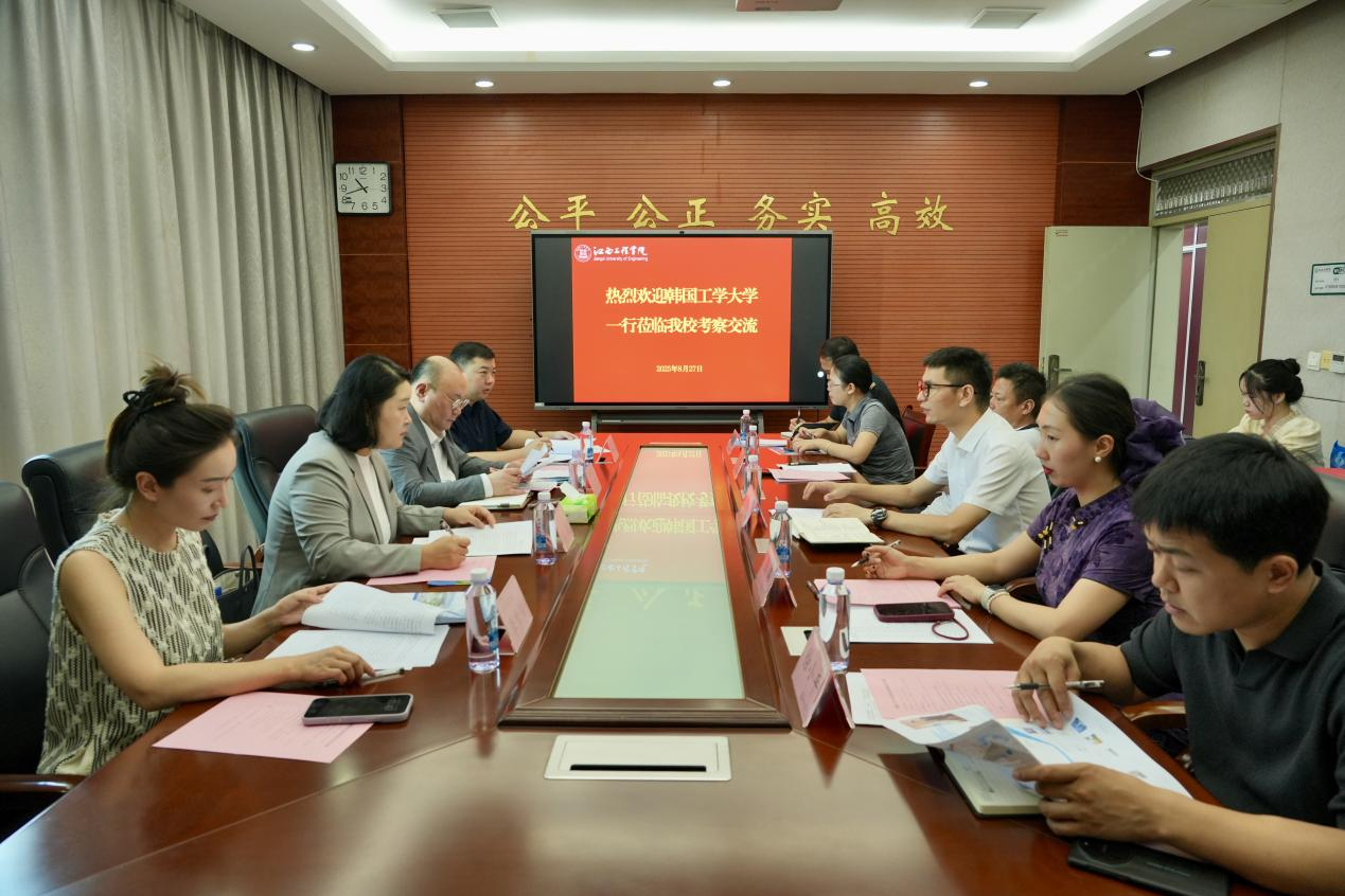 2025年8月27日上午,beat365体育官方网站与韩国工学大学交流座谈会在天工校区行政楼六楼会议室举行。此次会谈旨在推进两校在合作办学、科研合作与师生交流等方面的深层次合作。会前,韩国工学大学代表团一行在校领导陪同下,先后参观了天工校区和科技园校区,实地考察学校教学设施、实验环境及产学研融合成果。