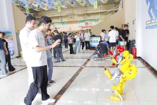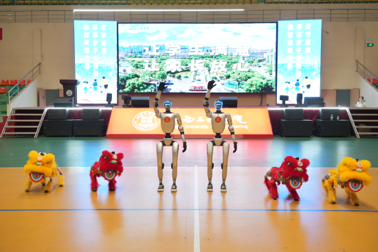 此外,校园门口的四足机器狗伴随音乐舞动,憨态可掬的模样让新生纷纷驻足拍照,缓解了初入校园的紧张,真正实现“人机互动・燃动青春”。